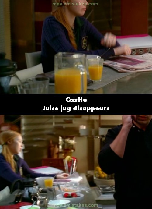Continuity mistake: During breakfast at Castle's loft a jug full of orange juice disappears off the kitchen island when Castle answers the phone. (00:01:40)