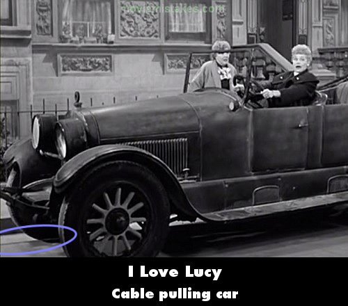 Visible crew/equipment: When Ethel's on the stoop in front of the building waiting for Lucy and Ricky, right before Ethel asks Ricky about Lucy's driving lesson, just as Ricky drives up we can see cables moving in front of the new Pontiac pulling the car. Then, when Ethel crashes the new Pontiac into the old car, the jiggling cables are again in front of the new car. Lastly, when Lucy finally starts the old car's engine, now there's a moving cable in front of the old car as well. (00:09:50)