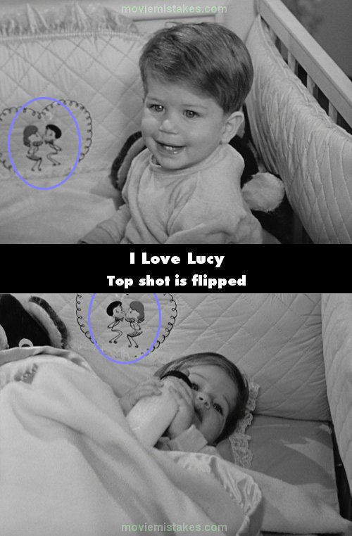 Continuity mistake: While Ricky's telling the bedtime story in Spanish to Little Ricky (worth watching just for this darling scene), in the closeups of the baby in the crib, the pillow bumper has an embroidered heart with stick figures, which flips in reverse. Actually, the last closeup of Little Ricky lying down is the normal shot, but all the closeups of the baby sitting up are the flipped shots. (This pillow bumper has stick figures of Lucille Ball and Desi Arnaz, and can be seen in previous episodes). (00:06:40)