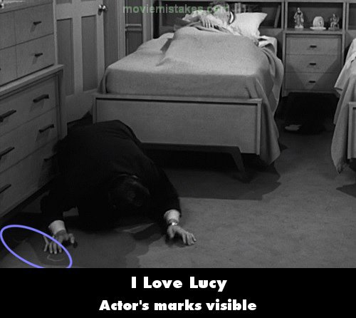 Visible crew/equipment: After Ricky sneaks the dollar bill into Lucy's purse he sees her stirring in bed, and when Ricky ducks down to hide from Lucy, the two curved chalk actor's marks are visible on the carpet. (00:07:15)