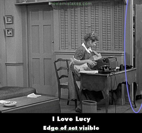 Visible crew/equipment: While Lucy starts taking notes about Ethel, Fred walks in and soon asks, "What's going on this booby hatch," then just as Lucy rushes back to the desk, we can see the end of the set wall and there's some kind of partition in front of the kitchen set. (00:02:35)