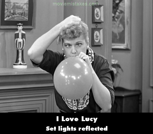 Visible crew/equipment: While Ethel and Lucy are trying to frighten Mr. Beecher so he'll leave the apartment, when Lucy blows up the balloon the reflections of all the overhead set lights are visible on the balloon. (00:23:00)
