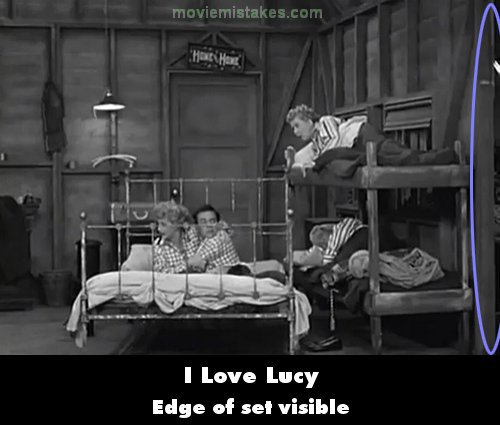 Visible crew/equipment: While Lucy and Ricky are lying in the sagging mattress "canoe", when the train passes and their bed rolls towards the bunk bed, the end of the set wall is visible at the right side of the screen. (00:17:30)