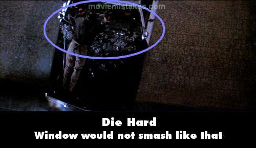 Factual error: When Willis kills the terrorist and throws him out the window onto the police car, the body lands on the windshield, and it shatters into little bits. The windshields on 80's cars were double paned with a thin, strong plastic between each pane, to keep them from breaking into little bits in accidents. Only the side and back windows would shatter like that. (00:54:45)