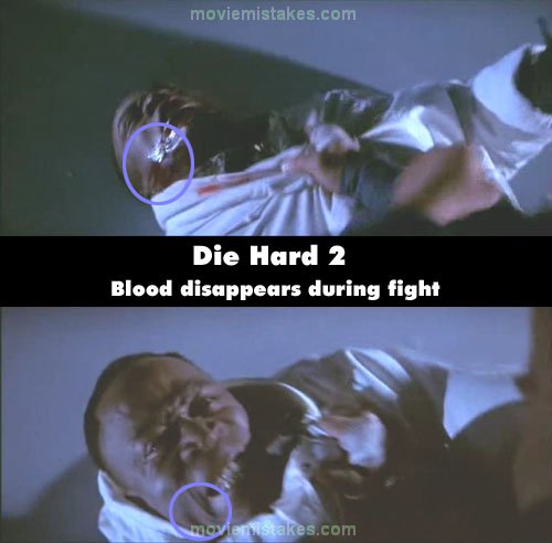 Continuity mistake: John McClane and Major Grant are fighting on the wing of the aeroplane, and Major Grant's mouth gets extremely bloody. The shot switches to McClane and then back to Grant, whose mouth is still bloody. However, after the shot switches back from McClane to Grant, Grant's mouth is no longer bloody. (01:47:10)