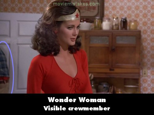Visible crew/equipment: When Wonder Woman is in the kitchen with the children telling them they should take care of themselves, a crew member's back is visible at the left side of the screen.