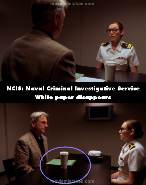 Continuity mistake: When Gibbs is talking to the Lieutenant about her rights, his has his papers next to a green folder. Camera changes and the papers have vanished. (00:17:10)