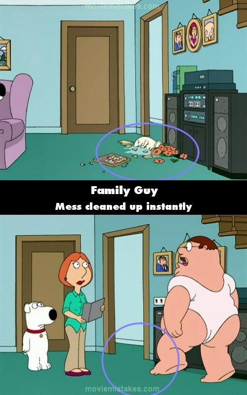 Continuity mistake: When Peter walks away from Brian with the hula hoop around his waist, he runs into the stereo, knocking a vase of flowers on the floor, shattering the vase. Next shot shows the mess cleaned up without anyone even cleaning it. (00:04:45)