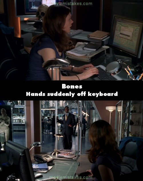 Continuity mistake: At the start when Dr. Goodman interrupts Bones, her hands go from the keyboard to on the arm of her chair instantly. (00:00:45)