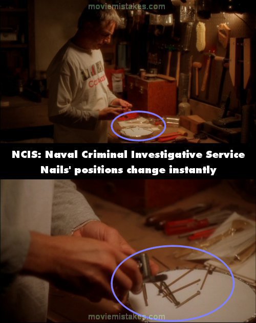 Continuity mistake: When Gibbs drops the nails on the food carton, the position of the nails goes from spread out to grouped together instantly. (00:19:50)