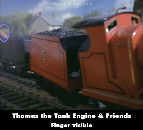 Visible crew/equipment: When James crashes into the tar wagons, a crew member's finger can be seen pushing him.