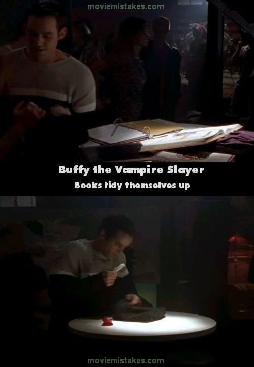 Continuity mistake: While studying at the Bronze, Buffy and Willow leave their books on the table to go and dance. Spike calls them outside to fight a vampire, and when Xander runs back inside to grab a stake the books have all been put back into Buffy's bag. (00:14:00 - 00:15:45)