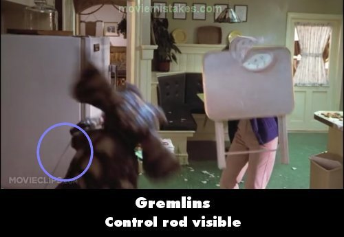 Revealing mistake: As the second Gremlin in the kitchen is flinging dishes, the control rods attached to the puppet's left arm is visible.