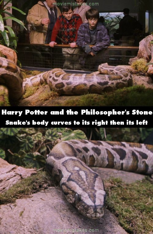 Continuity mistake: In the scene where Harry and the Dursleys visit the zoo, the first shot you see of the snake, he is lying on a bare rock with only moss on it. He is also lying with his head facing the window, and his body is curving to the right. However, after Dudley walks away and the shot returns to the snake, his body is curving to the left and now there are plants directly behind him where there was only moss before. (00:06:00)