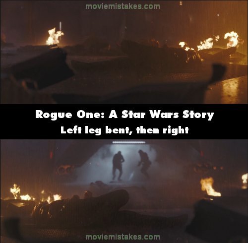 Continuity mistake: After the facility on Eadu is ambushed by the Rebellion, Krennic is escorted back to his ship and looks back at Galen Erso's body. When he looks over, Galen is shown with his right leg completely straight and his left leg at an angle, but when he is next seen, a few shots later, it is now his left leg completely straight and his right leg at an angle. (01:07:35)