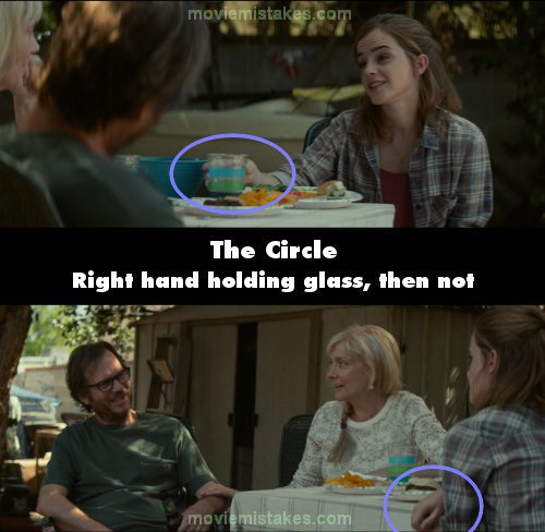 Continuity mistake: When Mae is telling her parents how Annie helped get her the job, when the shot is on Mae, she is holding a glass of water with her right hand, but when the shot is on her parents, she is resting her right hand on the table. (00:23:35)
