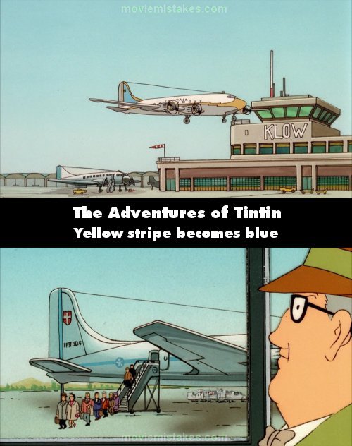Continuity mistake: The plane that lands in Syldavia has a yellow stripe when it is first landing, but has a blue stripe when the passengers are exiting the plane. (00:25:05)