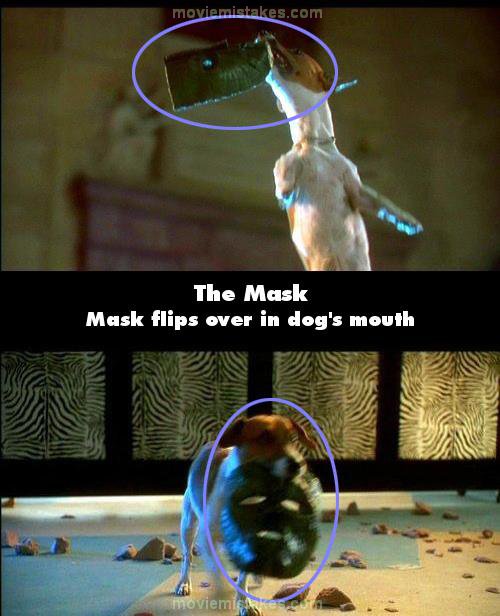 Continuity mistake: When Tina kicks the mask out of Dorian's hand and Milo leaps through the air to catch it, he catches it with his mouth at the mask's chin, yet when he lands the mask has been turned round so the chin end is now facing the ground. (01:22:45)
