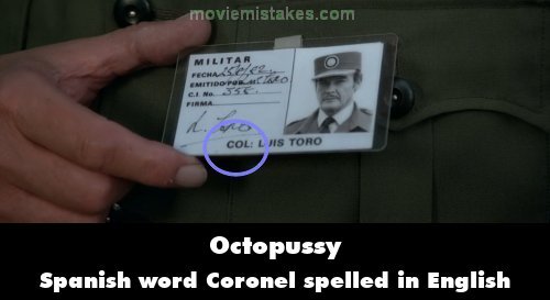 Factual error: Bond is given a tag in Spanish, but it shows the word Col., short for Colonel. It should read Coronel.