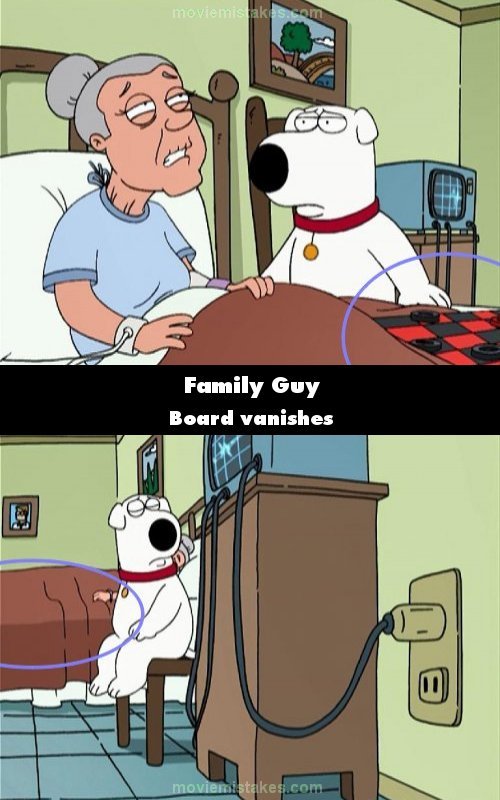 Continuity mistake: Brian is at a nursing home playing checkers with a lady. When he gets up, the checker board vanishes. (00:19:20)