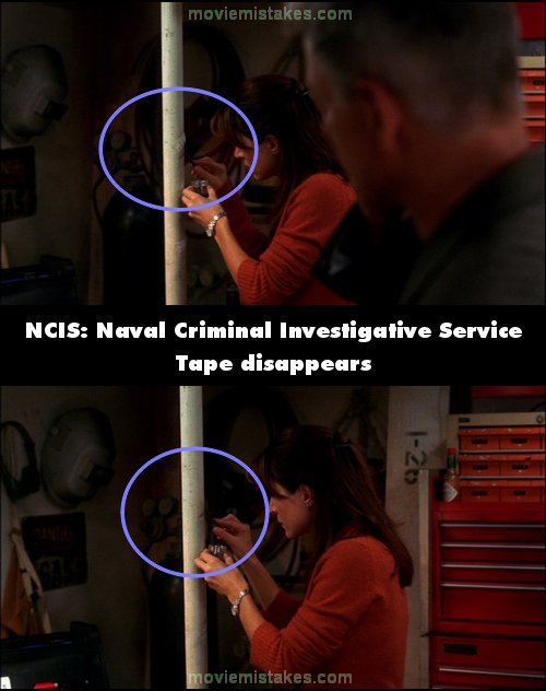 Continuity mistake: When DiNozzo rings Gibbs, we can see Kate taking metal scrapings on a pole that has tape on it just above her hands. When we get a closeup of Kate, the tape is not there. (00:25:50)