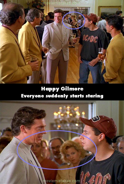 Other mistake: When Shooter is telling Happy to meet him and the other pros at the 9th green, everyone in the background is talking among themselves, then suddenly are closer and staring at them. (00:31:47)