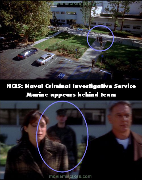 Continuity mistake: After speaking with the colonel about the incident, we see an aerial shot of the colonel and a marine walking off, leaving the 3 NCIS agents on their own with no-one behind them. As the agents start walking a marine appears behind them. (00:09:00)