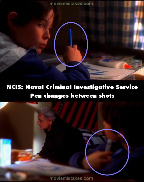 Continuity mistake: When Gibbs is talking to Kevin in his room, the position of the pen in Kevin's hand is constantly changing between camera cuts. (00:18:15)