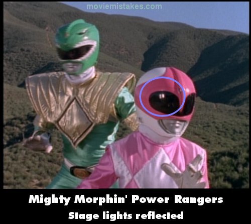 Visible crew/equipment: When the Pink, Green, Black and Red rangers teleport to take on the monster, we see the Pink ranger walk towards the camera. As she does, so the stage lights are reflected in her helmet. (00:13:30)