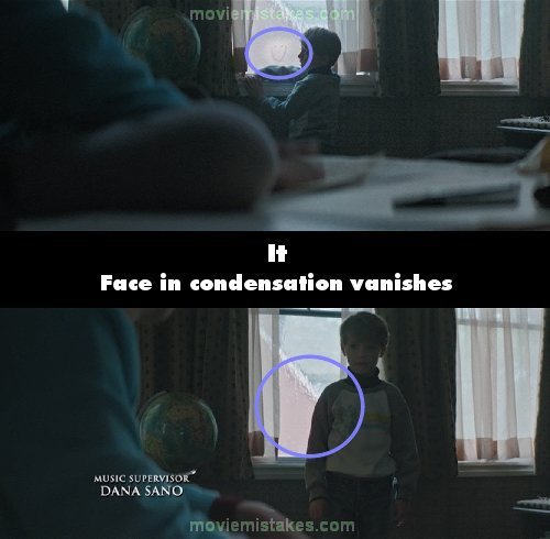 Continuity mistake: Early in the film, Georgie draws a smiling face into the misted window in Bill's bedroom. When Georgie turns around to approach his brother Bill, the condensation and smiling face are gone. As the scene concludes, we see a close-up of the smiling face again, fading off the bedroom window. (00:01:00 - 00:03:00)