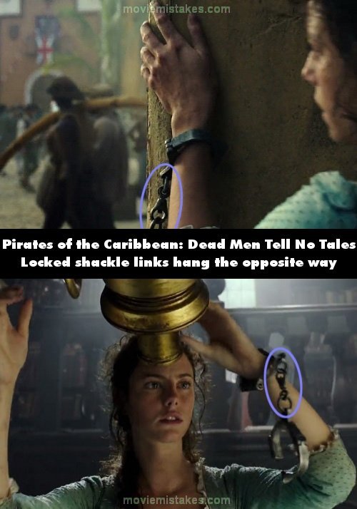Continuity mistake: When Carina escapes from her jail cell, just after we hear Mayor Dix dedicate the Royal Bank of St. Martin, in the closeup we see the locked shackle around Carina's left wrist and the hanging links with the other shackle dangling. Then when Mr. Swift sees Carina handling his telescope, in this closeup we see the shackle links are hanging the opposite way, revealing that the locked shackle around her left wrist had been the dangling shackle from the earlier shot.