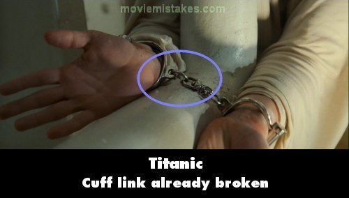 Revealing mistake: When Jack spreads the handcuffs over the pipe, we have a very clear close up shot of the links connecting the cuffs. In this shot you can see that the link nearest Jack's right hand is broken and not a complete link, therefore he should be able to separate the cuffs without going through the axe sequence. (02:00:05)