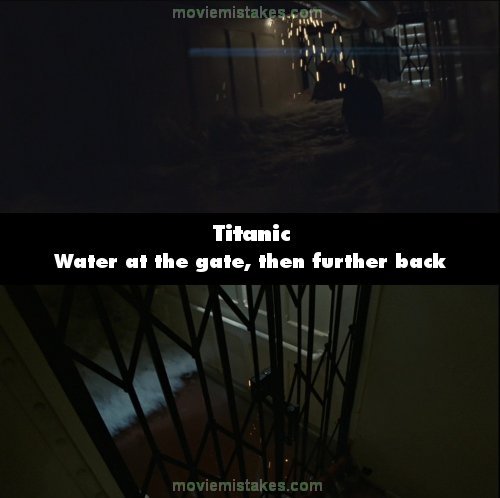 Continuity mistake: When Jack and Rose are being carried towards the locked gate by the water, we see the water and Rose hit the gate in the first long shot and then the camera changes to a close angle of the gate and Rose and the water have not reached the gate yet. (02:15:30)