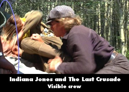 Visible crew/equipment: After Young Indy locks the two treasure hunters in the reptile train car he pulls a snake out of his shirt, and just as the third young treasure hunter tackles Indy we can see a crew member's arm and equipment at the left side of the screen, before it cuts to the long shot. (00:07:00)