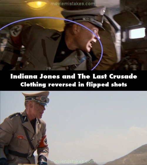 Continuity mistake: While Henry and Marcus are being held inside the tank, Indiana rides in circles and baits the tank to ram into one of the cars. In a following shot when we see Vogel walking toward the window inside the tank it's a flipped shot, note everything is backwards: strap, button, armband. Then two shots later, when Vogel shouts "quick" in German it's another flipped shot, and about five shots after that again flipped. (01:29:30)