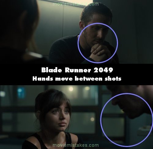 Continuity mistake: When K and his girlfriend are talking about a real boy name for the protagonist, as the camera cuts from one character's face to the other's Ryan Gosling's hands are holding up his chin in some scenes and in others they aren't. (01:15:00)