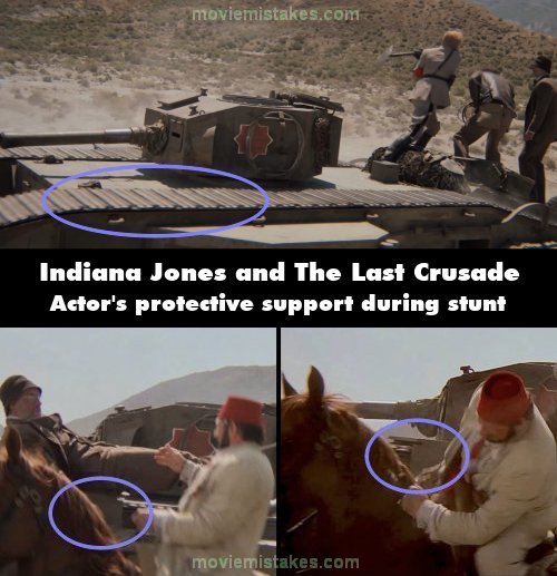 Revealing mistake: When Sallah rides up to the tank to help, just as Indy shouts, "Get Dad!" we can see that Henry is actually lying on protective support, and not lying directly on the moving tank treads. (01:35:40)