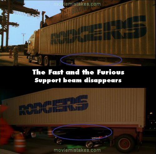 Continuity mistake: At the end of the opening credits when the freight is being placed on the truck, you can see the large support beam that goes across. In the next shot when the civic goes under the car, the support beam is gone. (00:00:40)