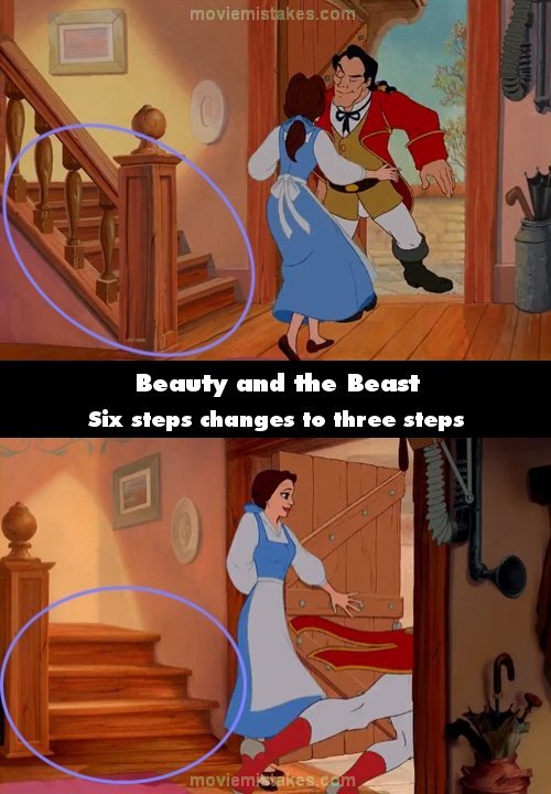 Continuity mistake: When Belle opens the door for Gaston there are six steps to the landing leading upstairs, but when Gaston leaves there are only three steps to the landing.