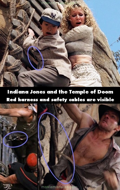 Visible crew/equipment: While clinging to the hanging bridge, just as Indy tries to grab Mola Ram's foot in the closeup we can see Indy's red harness and the wire cable protruding from his shirt. Then after Mola Ram orders his archers to shoot, when Short Round and Willie are shouting at Indy we can see a bit of Shorty's safety cable protruding from his shirt, and it's seen again after Mola Ram falls onto Indy, when Willie and Shorty are shouting once more.