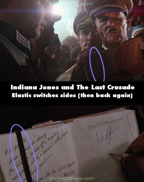 Continuity mistake: When Indy comes face-to-face with Hitler he hands over Henry's diary with its black elastic around the back cover, but in the closeup as the signature is being signed the elastic is around the front cover, then it's around the back cover again when Indy takes the diary back.