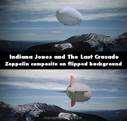 Other mistake: While Indy and Henry are aboard the zeppelin Indy tosses Vogel out the lounge window, and when Vogel shouts up to the departing airship, in the next exterior shot we see the zeppelin airborne against a scenic view. Later, when Indy realises the zeppelin is turning around it cuts to another exterior shot of the airship, and the scenic view is identical to the earlier shot, only it's been flipped. The images of the zeppelin facing two different directions were composited onto the same scenic background.