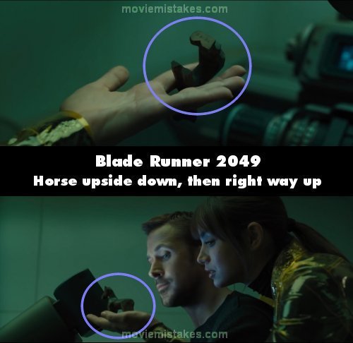 Continuity mistake: When Joi projects a holographic version of the wooden horse from K's memory, she flips it over revealing the date on the bottom, but when K goes to lower her hand, the horse is suddenly face up again. (00:56:25)