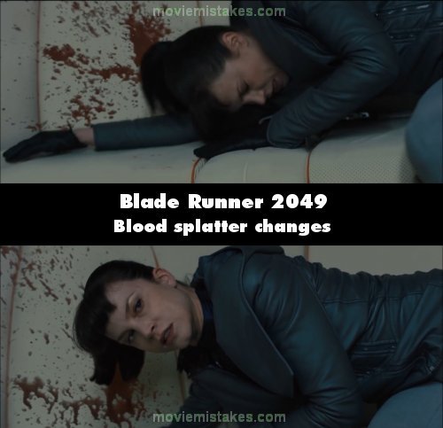 Continuity mistake: When K shoots at Luv, she falls onto the car seat, leaving a blood splatter over it. The appearance of the blood splatter made on the seat changes between shots. (02:21:55)