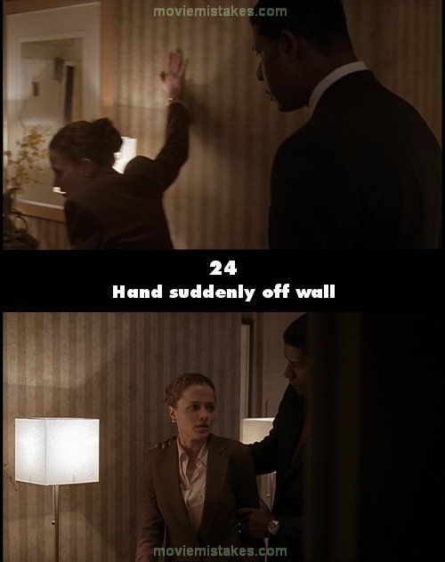 Continuity mistake: Elizabeth walks away from the security brief and puts her arm on the wall. When David approaches her, her arm is still on the wall. When the camera changes to the front angle, her arm is not on the wall any more. This is an instant cut. (00:06:30)