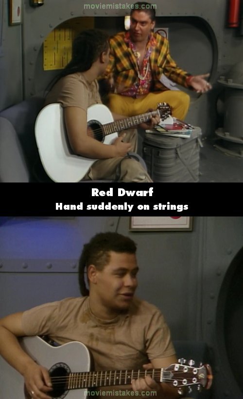 Continuity mistake: When Confidence is telling Lister that his song was the greatest love song ever, Lister has his right hand on his lap, but in the next shot, his right hand is suddenly on the guitar strings. (00:19:35)