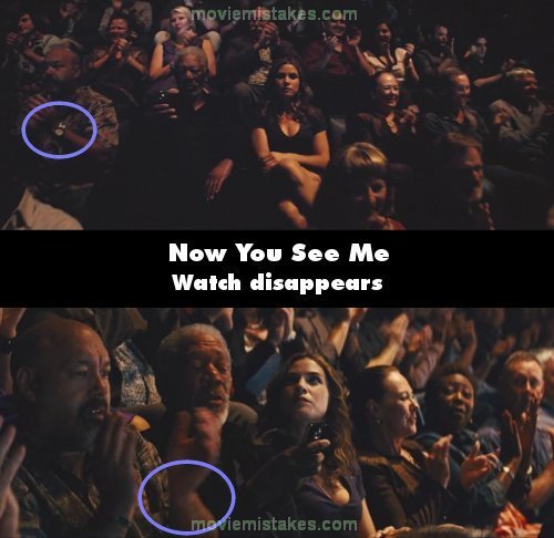Continuity mistake: When Thaddeus is first introduced, he is in the audience recording the Horsemen's Las Vegas show on his phone. In the shot where the camera pans from the stage over to Thaddeus in his seat, there is a man sitting next to him applauding with the crowd and there is a watch on the man's wrist. A couple of shots later, when Thaddeus tells the usher he is going to put his phone away, the watch has vanished. (00:16:00)