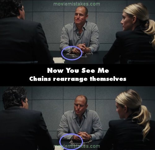 Continuity mistake: Dylan is reading Merritt's file and says to Merritt "Says here you are a mentalist. So what exactly is mentalism?" When Dylan finishes saying "Says here you are a mentalist", the shot cuts to Merritt. Between this shot and a shot of Merritt two shots afterward, the chains on Merritt's handcuffs that are laid across the desk change position without him moving. (00:28:25)