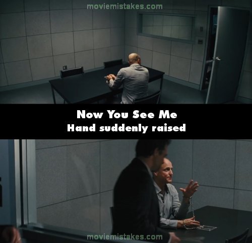 Continuity mistake: When Dylan and Alma enter the interrogation room to question Merritt, he starts talking to them, looking straight at them with his head turned to the right, with his hands on the table. In the next shot, he is looking straight forward and his left arm is suddenly raised. (00:27:25)