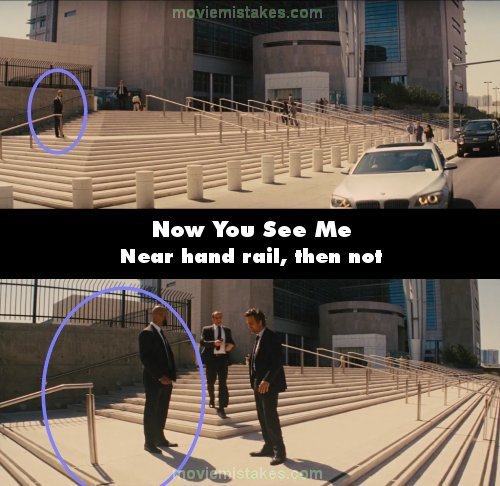 Continuity mistake: When the Horsemen are getting into their cars to leave the FBI, Evans is standing next to the hand rail. Dylan then runs up to Evans and he remains in his position, but when Fuller runs up to them, Evans is suddenly standing far away from the hand rail. (00:32:10)